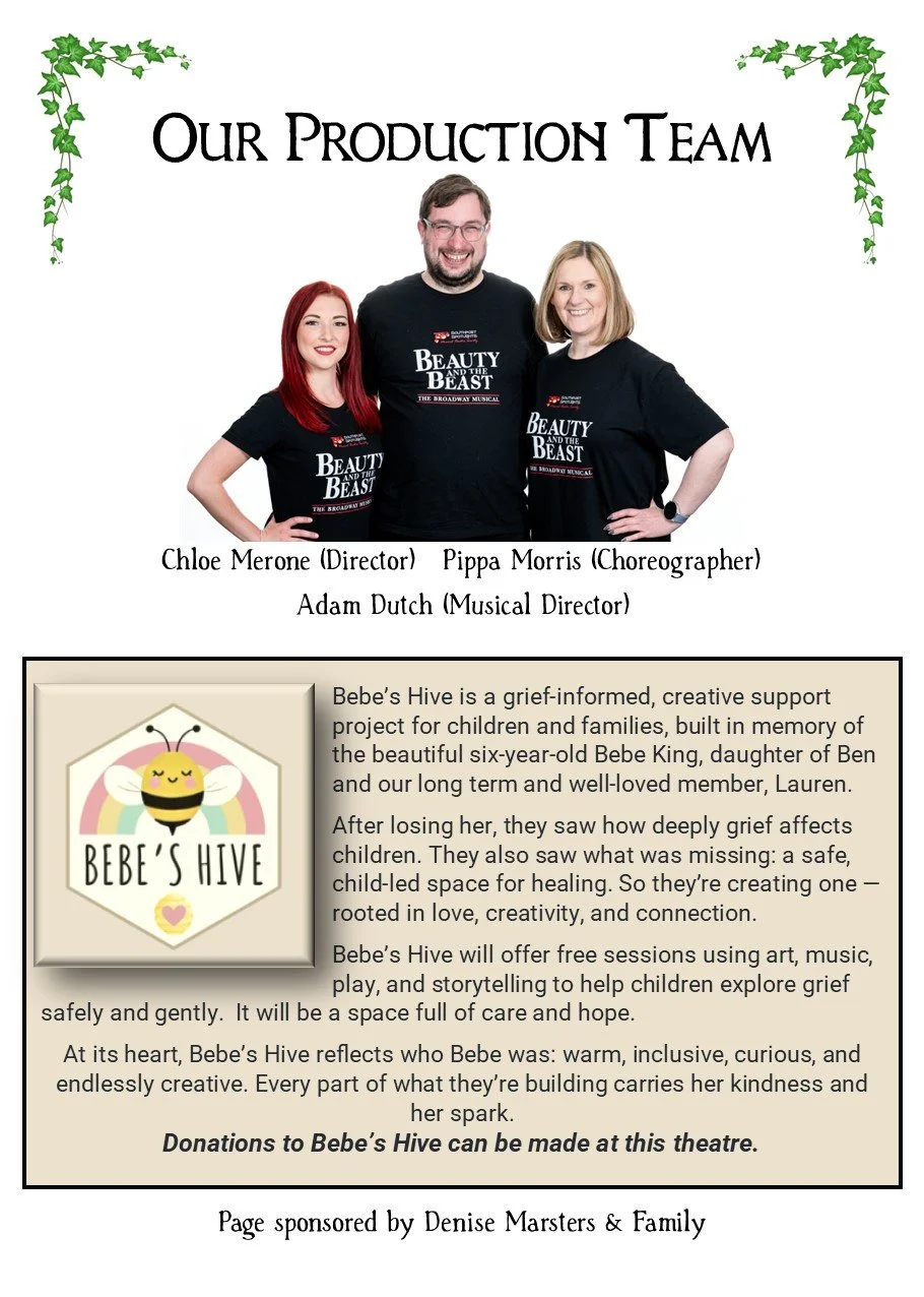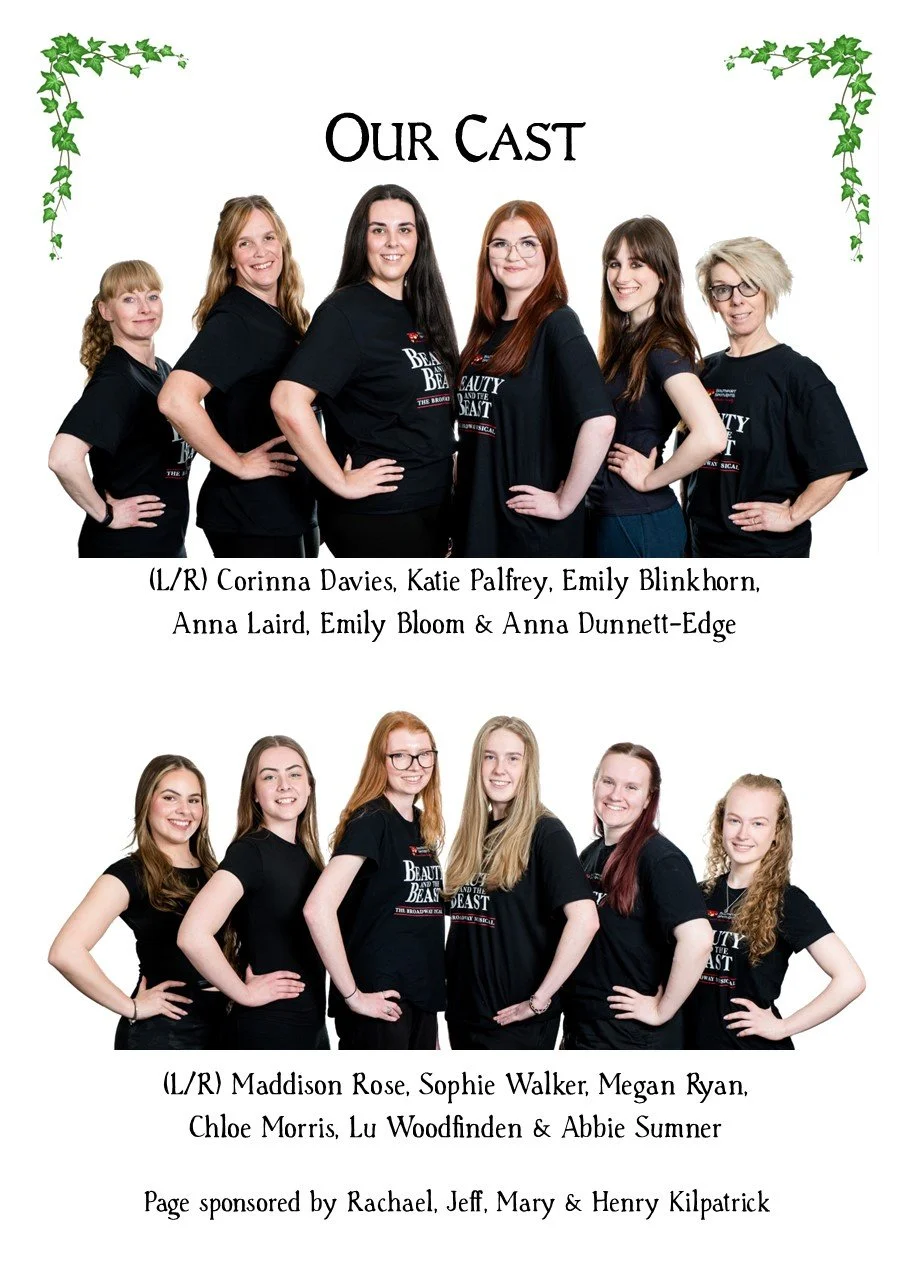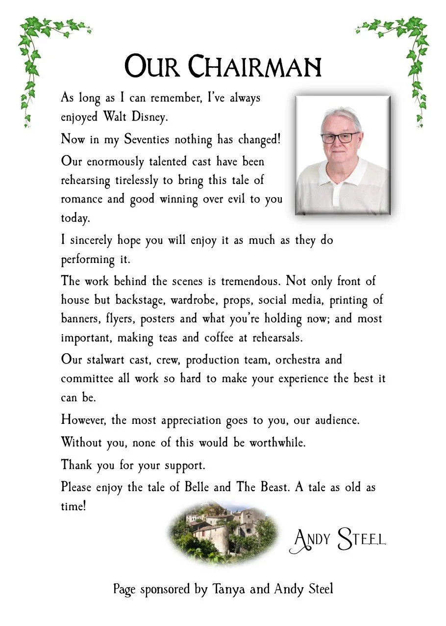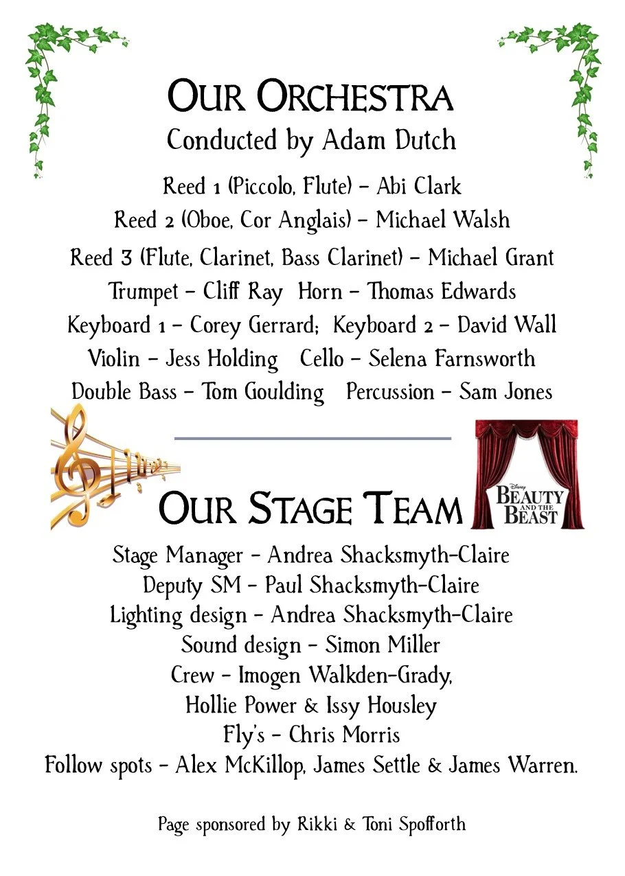 Staging/Tech/Set... thought the set was effective throughout using every inch of available space. Loved the two-tier castle set up which offered and provided so many opportunities. Scenes were created and enhanced by adding stage furniture which was done really well, although the pitfalls of moving scenery safely were highlighted during a solo by the Beast, when a fountain, brought on in blackout, set directly behind him, created an obstacle which he almost tumbled over when exiting. SOUND was great, just a tad loud I felt in Act 1 and I did over hear a few murmurings about the orchestra being a little loud during the interval ... but I felt all that was addressed during that interval and we had a much better balance in Act 2 LIGHTING... was creative and worked really well, although if I’m being ‘super picky’, I did feel it was a little dark at times and I would have loved ‘Mrs Potts’ to have been a little more illuminated during her wonderful rendition of ‘Beauty and the Beast’ although I think I understood why she wasn’t ... for fear of taking the ‘limelight’ from Belle and the Beast romantic dancing duo! The STAGE TEAM worked extremely hard throughout, doing a wonderful job in keeping the show moving at a great pace ... looking after all things stage wise Andrea Shacksmyth-Claire (Stage Manager & Lighting Design); Paul Shacksmyth-Claire (DSM); Simon Miller (Sound Design); Imogen Walkden-Grady, Hollie Power, Issy Housley (Stage Crew); Chris Morris (Fly’s); and Alex McKillop, James Settle and James Warren (Follow Spots)