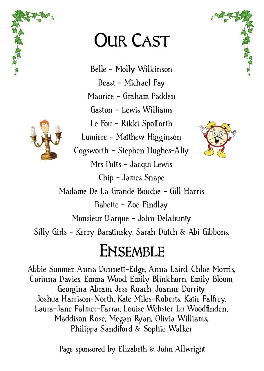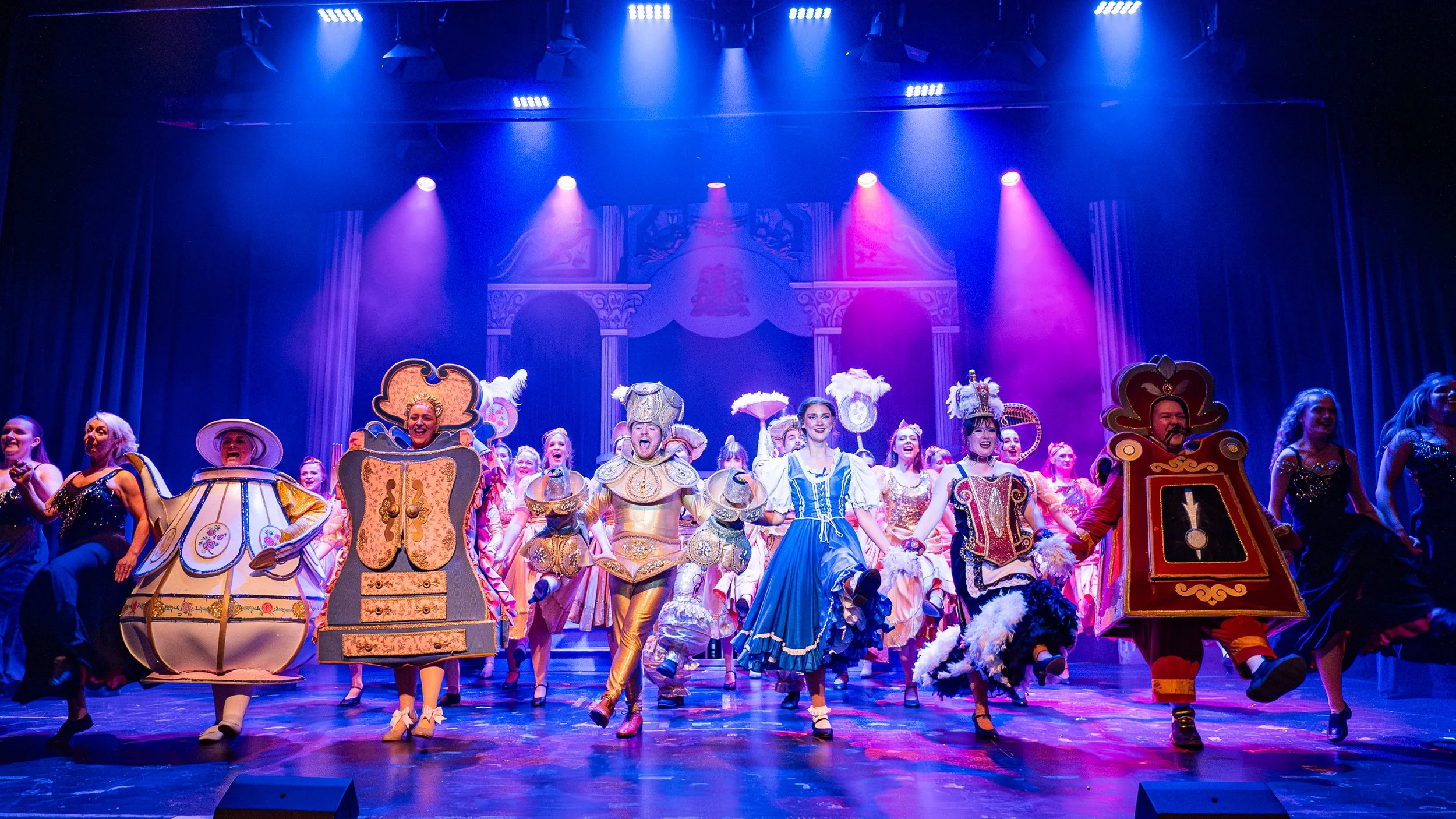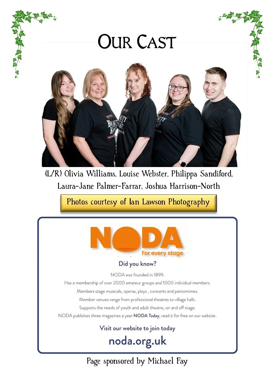 Staging/Tech/Set... thought the set was effective throughout using every inch of available space. Loved the two-tier castle set up which offered and provided so many opportunities. Scenes were created and enhanced by adding stage furniture which was done really well, although the pitfalls of moving scenery safely were highlighted during a solo by the Beast, when a fountain, brought on in blackout, set directly behind him, created an obstacle which he almost tumbled over when exiting. SOUND was great, just a tad loud I felt in Act 1 and I did over hear a few murmurings about the orchestra being a little loud during the interval ... but I felt all that was addressed during that interval and we had a much better balance in Act 2 LIGHTING... was creative and worked really well, although if I’m being ‘super picky’, I did feel it was a little dark at times and I would have loved ‘Mrs Potts’ to have been a little more illuminated during her wonderful rendition of ‘Beauty and the Beast’ although I think I understood why she wasn’t ... for fear of taking the ‘limelight’ from Belle and the Beast romantic dancing duo! The STAGE TEAM worked extremely hard throughout, doing a wonderful job in keeping the show moving at a great pace ... looking after all things stage wise Andrea Shacksmyth-Claire (Stage Manager & Lighting Design); Paul Shacksmyth-Claire (DSM); Simon Miller (Sound Design); Imogen Walkden-Grady, Hollie Power, Issy Housley (Stage Crew); Chris Morris (Fly’s); and Alex McKillop, James Settle and James Warren (Follow Spots)