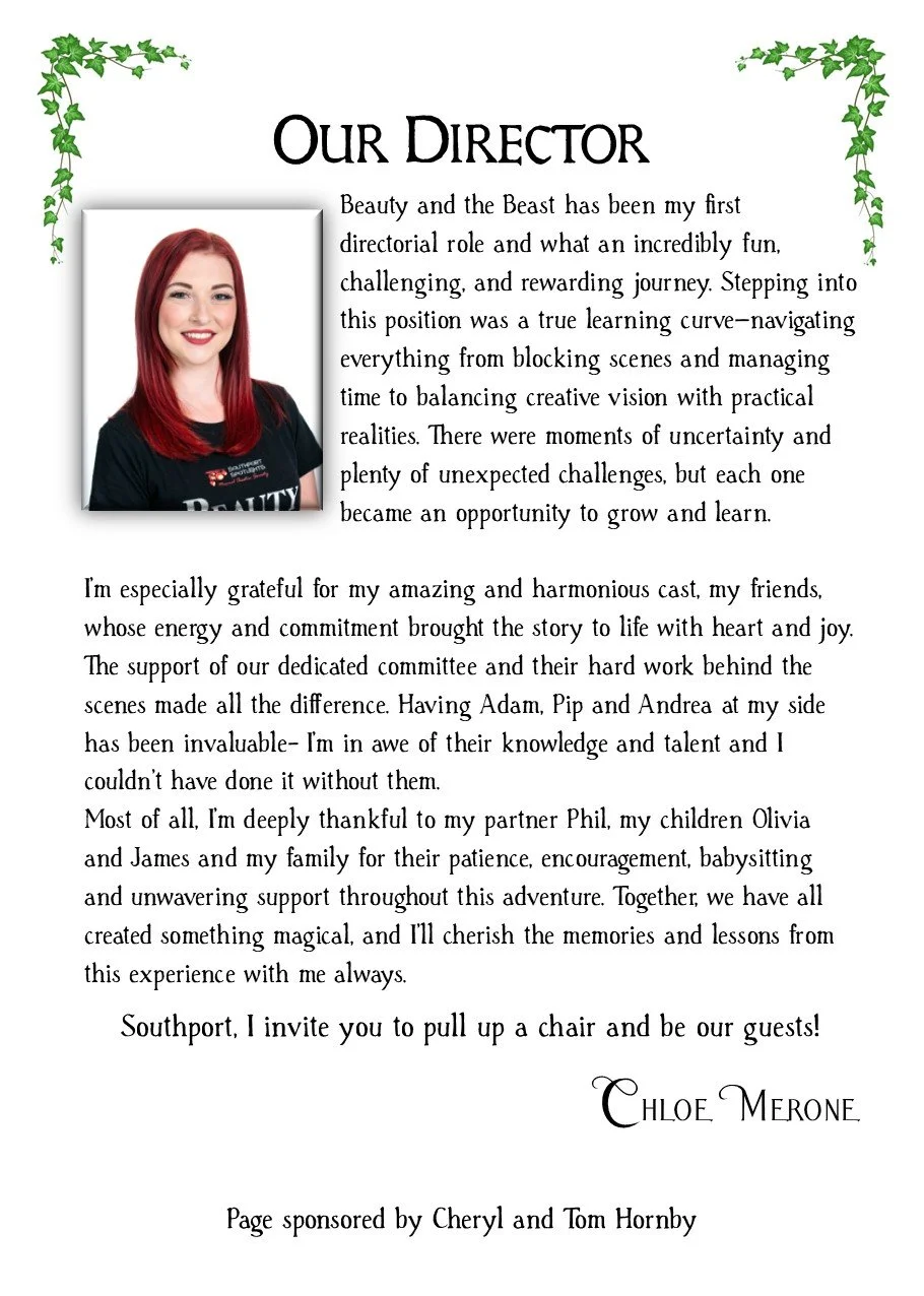 Production Team... when you see the word ‘Disney’ attached to any production your expectations always rise, you just know there’ll be iconic songs, unbelievable characters and a tale full of magic and expectation ... ‘Beauty and the Beast’ is just that and more! Tasked with bringing this Disney classic to stage was placed in the creative hands of first time Director Chloe Merone, along with the ever so experienced Adam Dutch (MD) and Pippa Morris (Choreographer)... did they rise to the challenge .... heck YES! Energy, effort, chemistry ... all evident throughout! We had great cast, with no real weak links ... everyone had their part to play and played it with conviction and confidence. The cast looked great, sounded great and as soon as those lights came up, complemented and supported each other ever so well! Chloe did a great job with the casting and handled the ‘expectations’ attached to a Disney classic extremely well. Adam and his charges provided some great musical support with some wonderful harmonies created, which is a feature we’ve come to expect from all ‘Spotlights’ productions! Pippa’s choreo was ever so effective, loved the choreo in ‘The Mob Song’ especially the ‘clicking glasses’ routine clever and well executed, plus the choreo for ‘Be our Guest’ was superb... be very proud you three... great job!