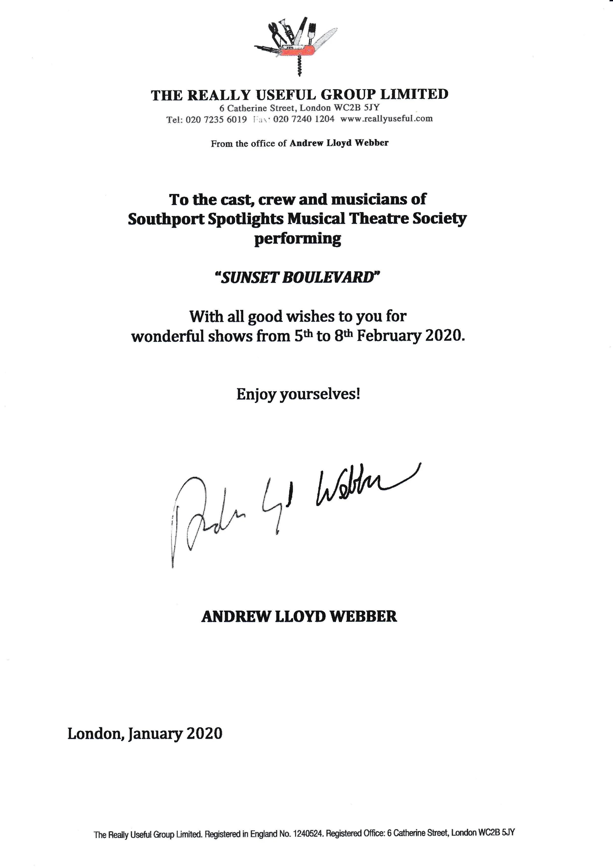 Thank you so much for inviting my wife and I, we thoroughly enjoyed the production and thank you for your hospitality throughout.